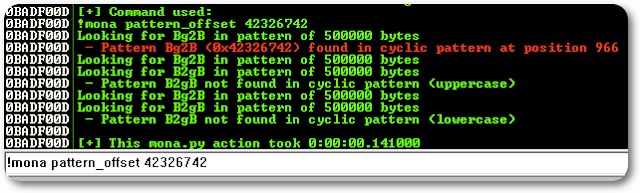 After sending the generated pattern, you can grab the value from the access violation, throw back in the selected tool and get the offset as the result, which in this case is 966.