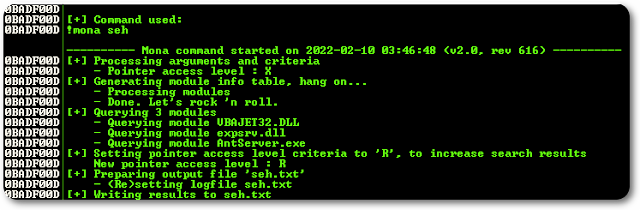 In order to transfer the execution flow from SEH back to nSEH, a gadget with the POP POP RET instructions will be used. For that, one can use Mona to generate a text file with a bunch of gadgets.