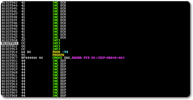 We can observe all the breakpoints, all the A’s before it, and the D’s after. We can now perform a short jump to land directly after those unwanted instructions, where all the INC ESP space will be filled the the malicious code.